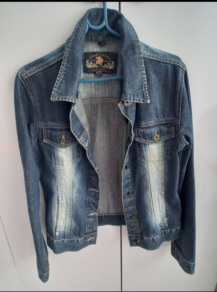 Mavi denim kumaştan yapılmış, düğmeli, notched lapel yaka ve uzun kollu kadın ceket. Normal kesim ve parlak görünüme sahip, günlük sokak stili için uygun.