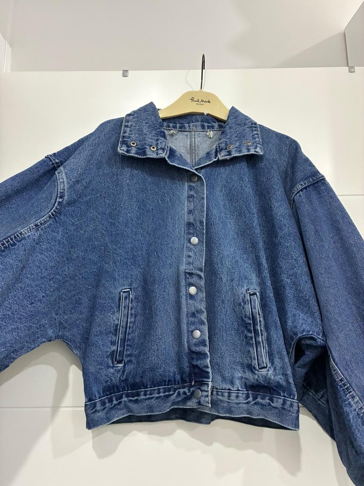 Düğmeli, uzun kollu, mavi denim ceket. Salaş kesim, bisiklet yaka ve günlük sokak stili için uygundur. Balom kollu 2 kez tek giyildi