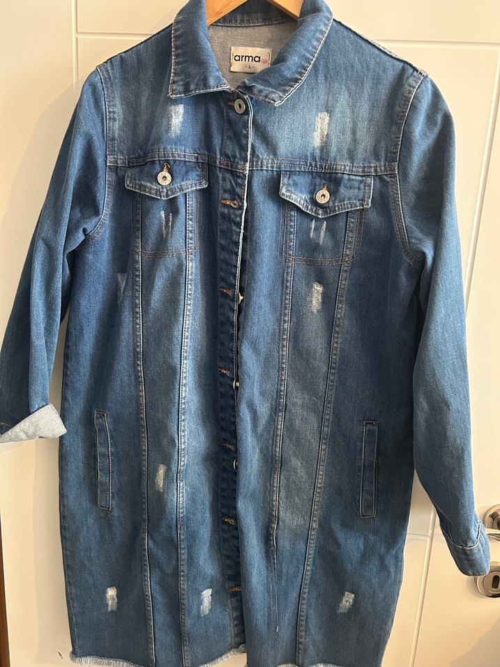 Parlak mavi renkte, düğmeli, normal boy midi kesim kadın denim ceket. Geniş kesim, uzun kollu ve yakası notched lapeldir. Günlük kullanıma uygun casual tarzda.