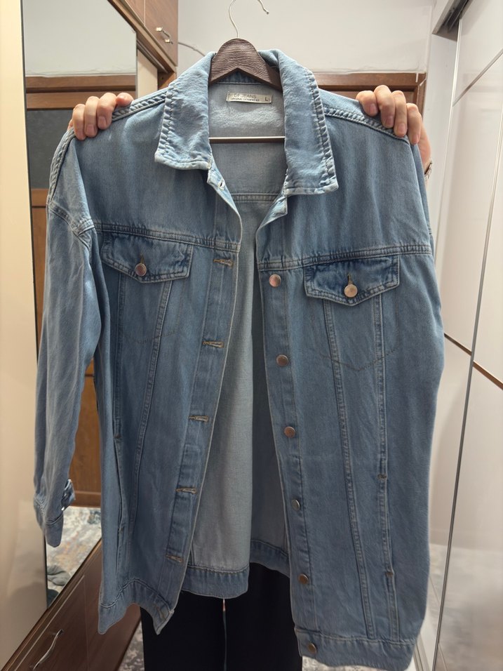 Düğmeli, bol kesim mavi denim ceket, uzun kollu ve normal midi boyda. Rahat sokak stili için uygundur.