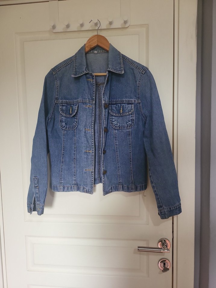 Düğmeli ve cepli, uzun kollu mavi denim ceket, rahat bol kesim ve klasik yaka ile günlük kullanıma uygun.