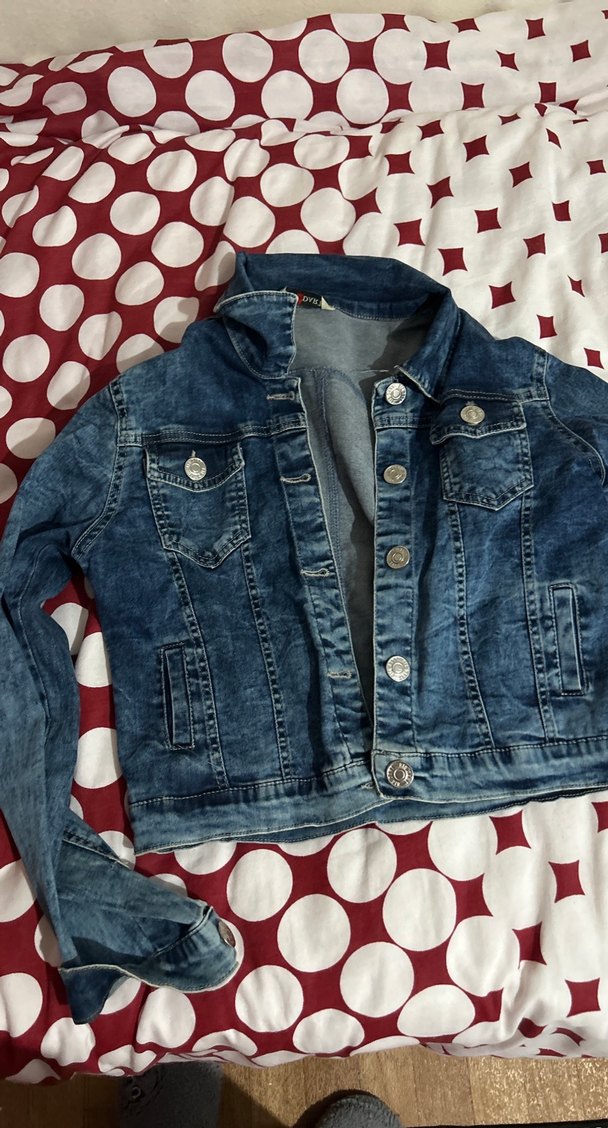 Düğmeli ön cep detaylı, uzun kollu, normal boyda, oturan kesim mavi kadın denim ceket. Günlük rahat sokak stili için uygundur.