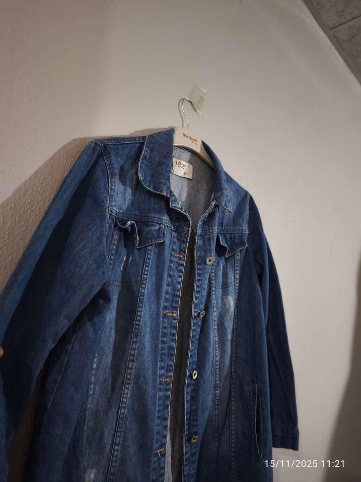 Düğmeli, uzun kollu, mavi denim ceket. Salaş kesim, normal midi boyda, yakası kesik ve desen içermeyen günlük rahat stil için uygun.