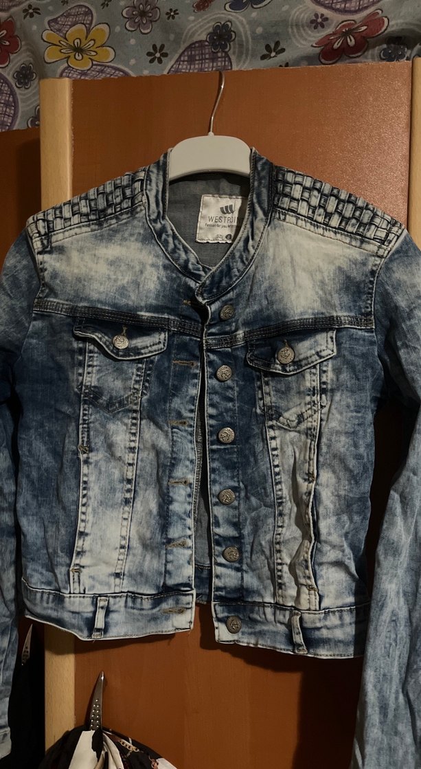 Düğmeli, uzun kollu, fit kesim mavi denim ceket. Notlu yaka ve omuzlarda kapitone detaylarıyla günlük sokak stiline uygun.