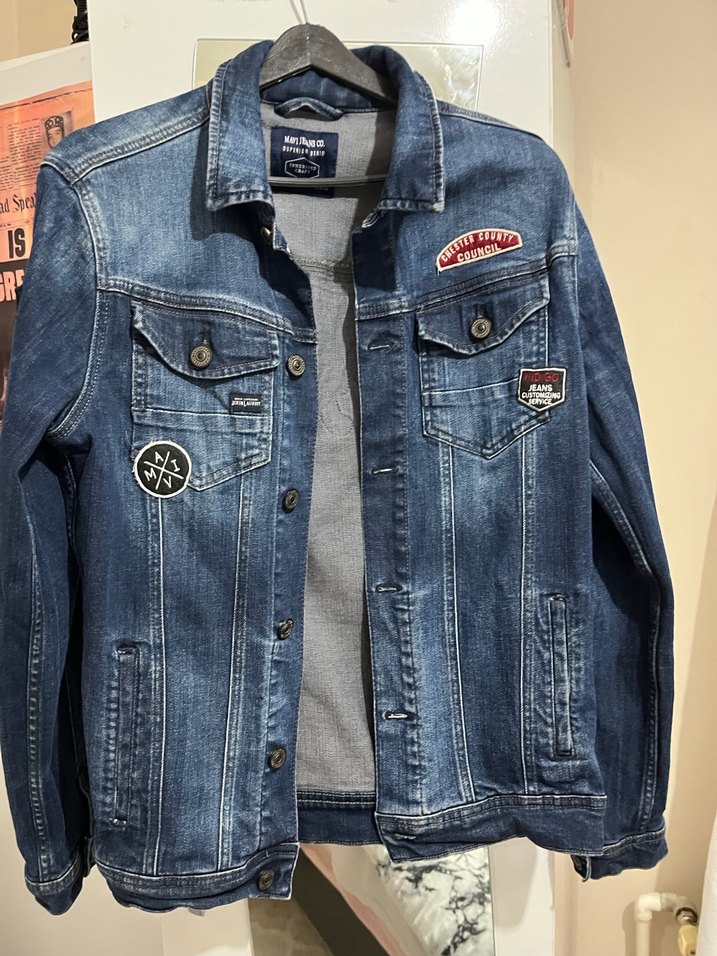 Düğmeli, uzun kollu, bol kesim mavi denim ceket. Çentikli yaka ve yamalı detaylar içerir, gündelik sokak tarzı için uygundur.