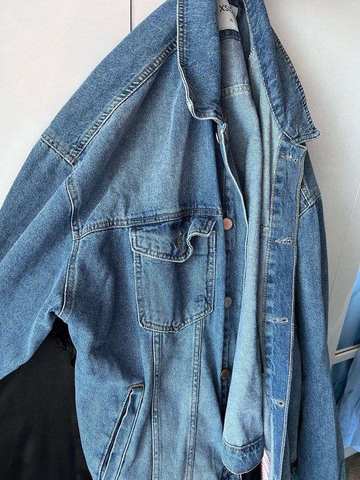 Mavi denim ceket, düğmeli ve kesimli yakalıdır. Salaş kesim, askılı kollar ve midi uzunluktadır. Günlük ve rahat sokak stiline uygundur.