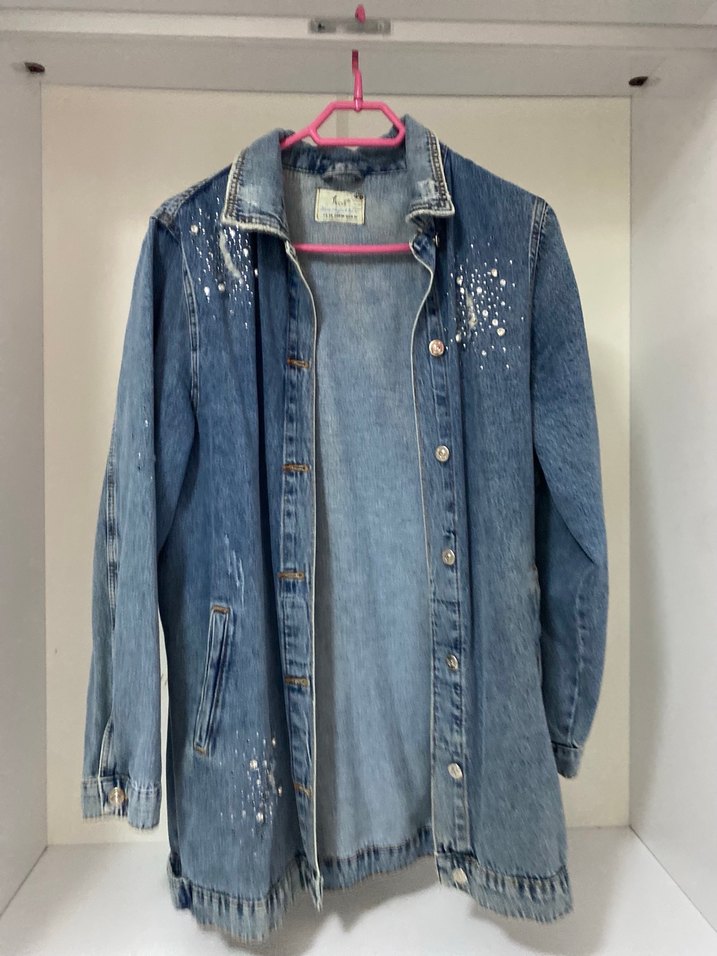 Parlak mavi denim ceket, düğmeli ve bol kesim. Notlu yaka ve uzun kolludur, günlük rahat sokak stiline uygundur.