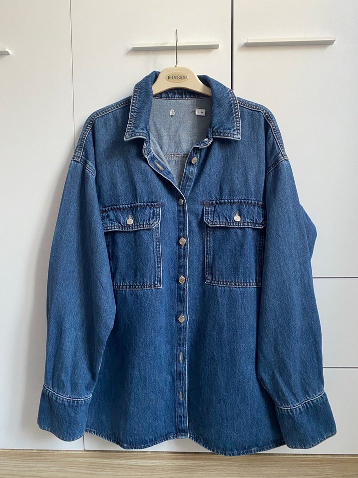 Mavi denim kumaştan, düğmeli, uzun kollu, normal midi boyda ve bol kesim kadın ceketi. Parlak dokusuyla günlük kullanıma uygundur.