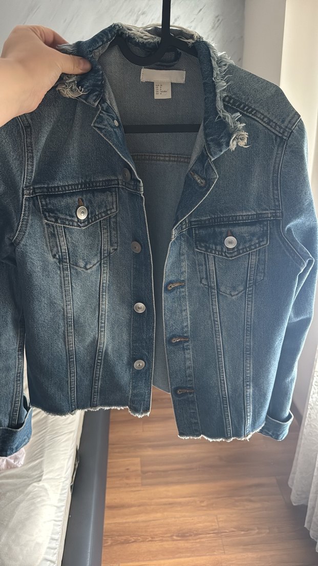 Düğmeli, fitted kesim mavi denim ceket kot renkte ve kesik yaka detayına sahiptir. Uzun kollu, normal midi boyda, günlük rahat stil için uygundur. M Beden H&M 1-2 kere giyildi