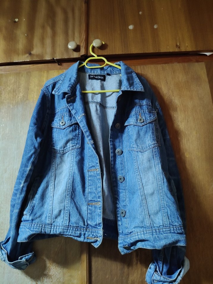 Düğmeli, bol kesim mavi denim ceket. Normal midi boy, yakası kesikli, askılı kollu, günlük rahat stil için uygundur.