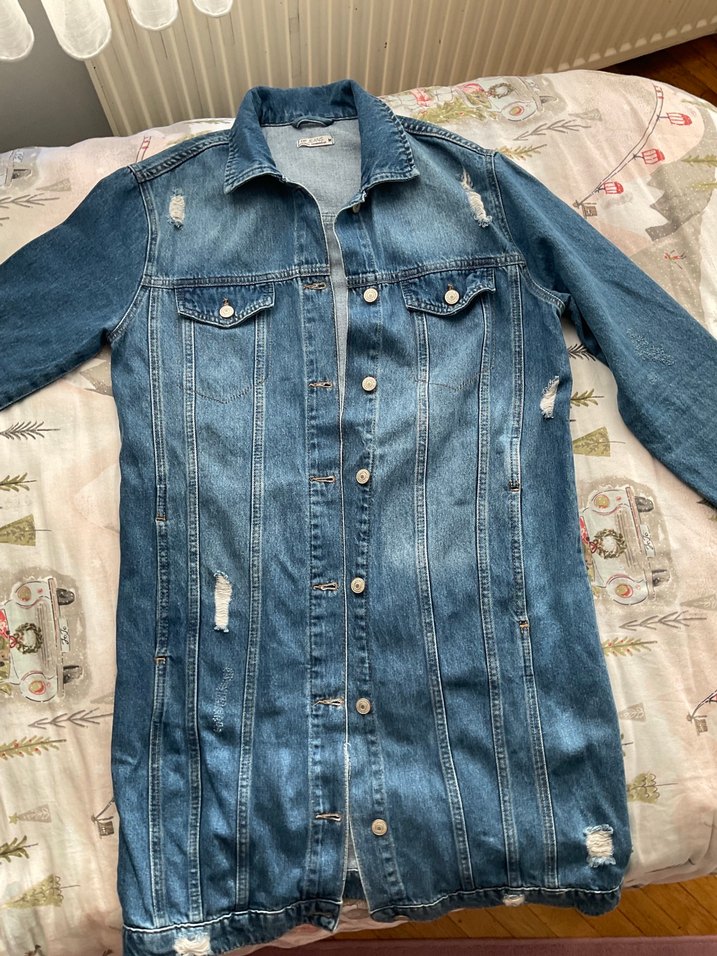 Bu açık mavi denim ceket, düğmeli ön, kesik yaka ve uzun kolludur. Rahat kesimi ve midi boy uzunluğuyla günlük sokak stiline uygundur. Hafif yıpratma detayları mevcuttur.