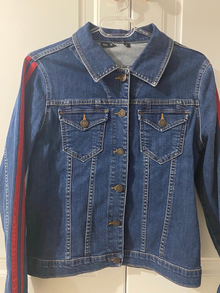 Düğmeli, uzun kollu, kesimli mavi denim ceket. Parlak görünümlü, kol kısmında kırmızı şeritlerle günlük ve sokak stiline uygun.