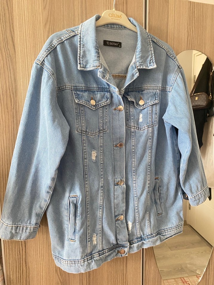 Parlak mavi denim ceketin düğmeli kapaması ve kesimli yakası vardır. Salaş kesimi, uzun kolları ve midi boyu ile gündelik sokak stili için uygundur.
