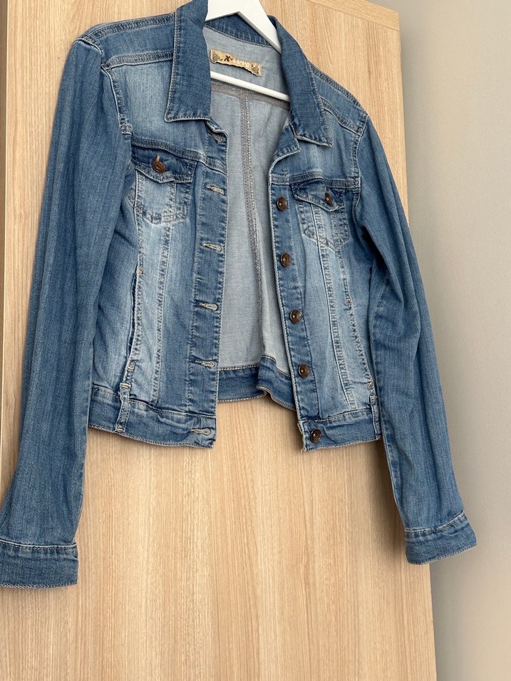 Düğmeli, fit kesim, mavi denim ceket; notched lapel yaka ve uzun kolludur. Az kullanıldı.