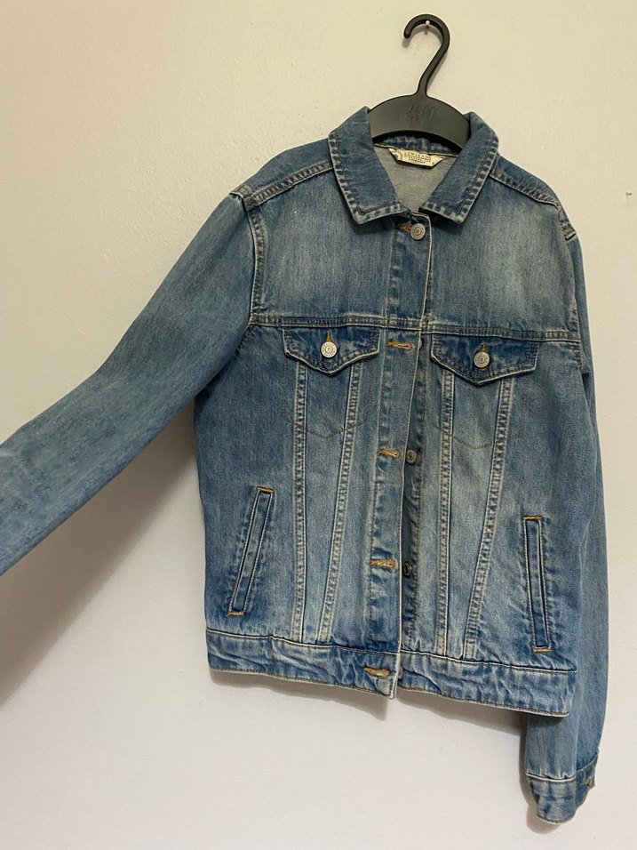 Düğmeli, uzun kollu, notalı yaka ve bol kesimli mavi denim ceket, günlük kullanıma uygun rahat bir stil sunar.