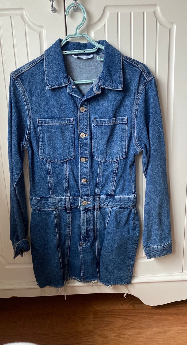 Düğmeli ve oturan kesime sahip kadın denim elbise, yakalı ve uzun kolludur. Parlak mavi renkte, günlük rahat stil için uygundur.