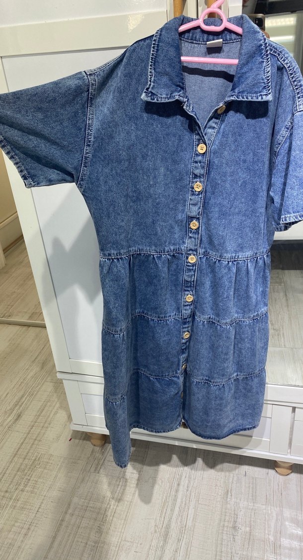 Mavi denim elbise, düğmeli ön, kısa kollu ve yakalı. Bol kesim ve parlak batik deseniyle rahat kullanım sağlar.