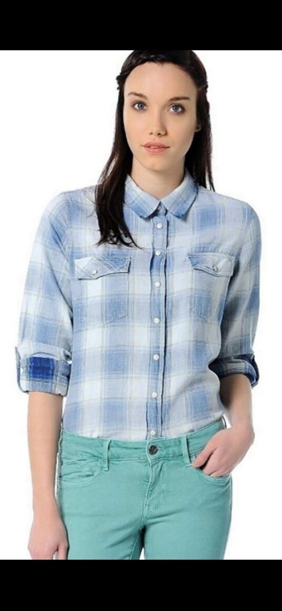 Düğmeli ön kısmı, uzun kollu, yakalı ve gevşek kesim mavi pastel tonlarda batik desenli denim gömlek.