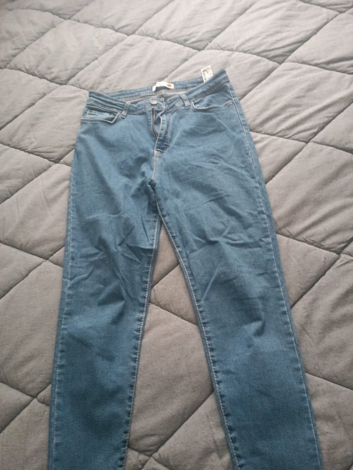 Düğmeli, normal boy, mavi kadın denim jean. Rahat kesim ve desen içermeyen tasarımla günlük kullanıma uygun.