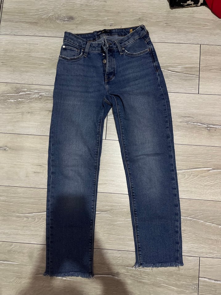 Düğmeli önde, regular fit mavi kadın denim jean. Orta boy, desen içermeyen, gündelik kullanıma uygun normcore tarzda rahat bir model.