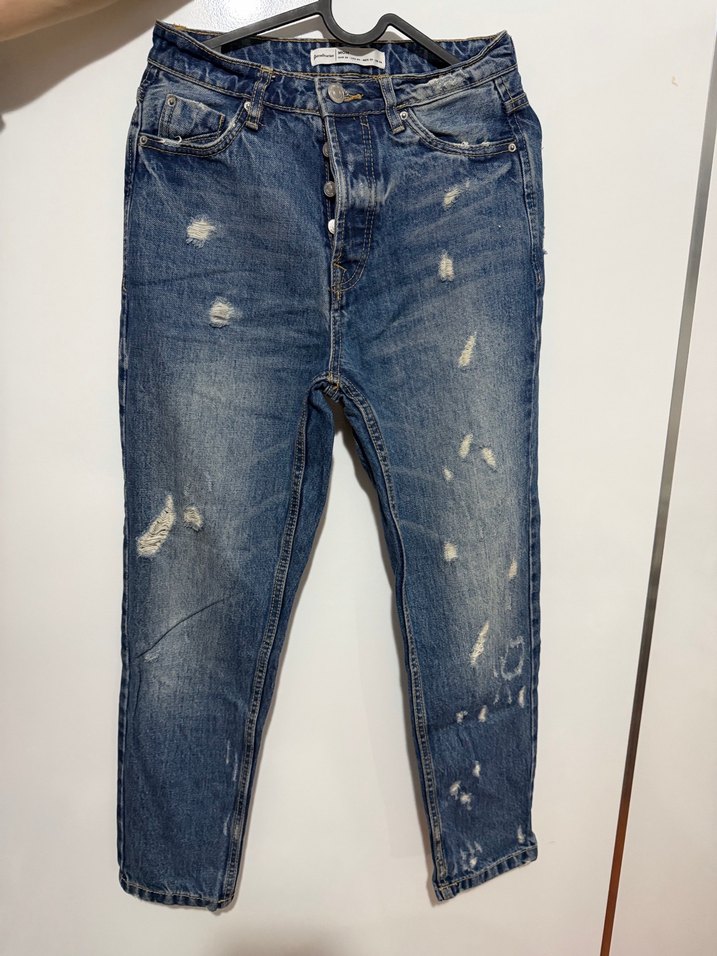 Düğmeli, bol kesim mavi denim kadın jean. Midi boya sahip, hafif yıpranmış detaylarla günlük sokak stili için uygundur.
