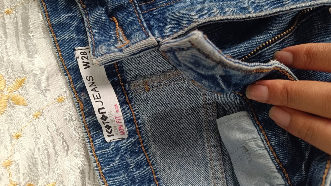 Düğmeli ve baskılı detaylara sahip, normal boyda mavi fitted denim kadın jean. Sokak stili ve günlük kullanıma uygundur.