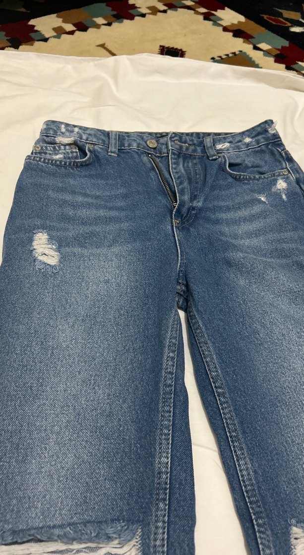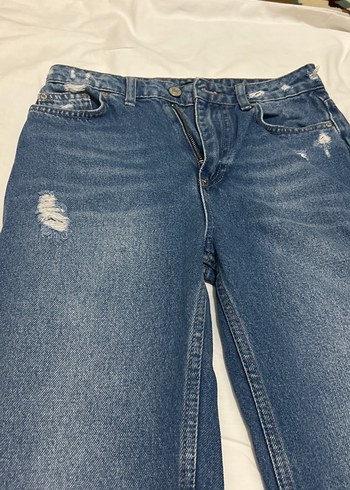 Düğmeli, midi boy, bol kesim kadın denim jean. Parlak mavi kumaş üzerinde hafif yıpratma detayları bulunur, gündelik sokak stili için uygundur.