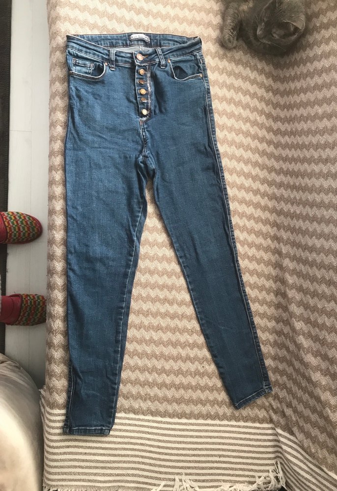 Düğmeli, bol kesim, mavi denim kadın jean. Normal boyda, midi uzunlukta, günlük kullanıma uygun rahat stil.