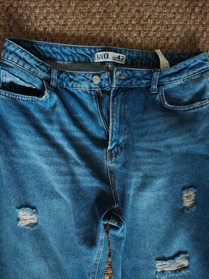 Düğmeli, ortal kesim mavi denim kadın jean, yırtık detaylı, 42 beden. Günlük rahat kullanıma uygun.