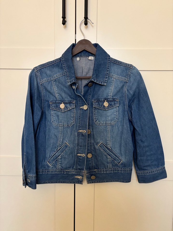 36 beden İki koltuk arası 44 cm Uzunluk 47 cm Düğmeli ön ve kesik yaka detaylı mavi denim ceket. Normal kalıp, yarım kollu ve crop boyda, günlük rahat sokak stili için uygundur. Tesettürlüler için etek üstü güzel bir seçenek.