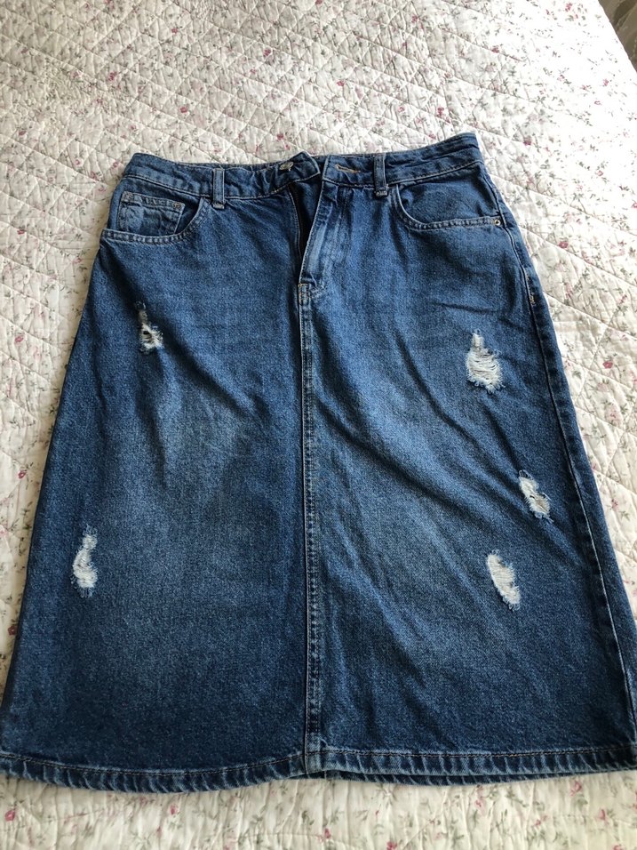 Düğmeli ön kısmı ve yıpranmış detaylarıyla mavi denim midi etek, rahat kesimiyle günlük kullanıma uygundur. Sadece birkaç kez kullanıldı tertemiz