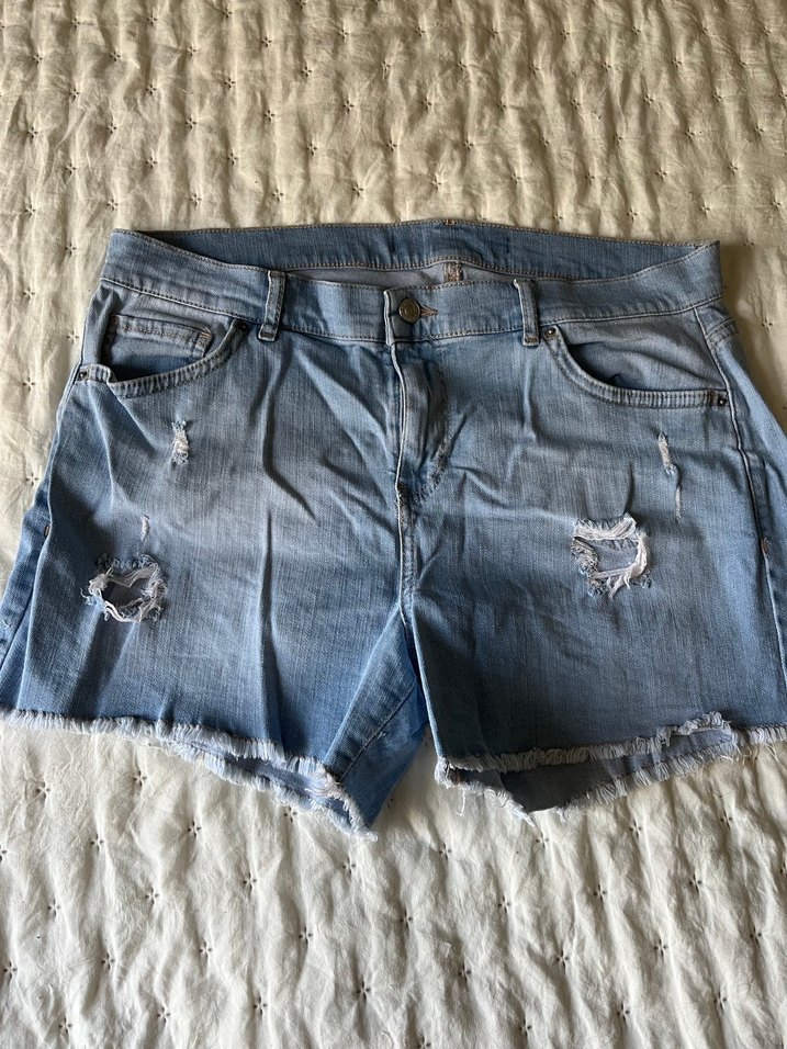 Düğmeli, yırtık detaylı ve bol kesim mavi denim mini şort. Sokak stiline uygun, günlük kullanıma rahat bir seçim.