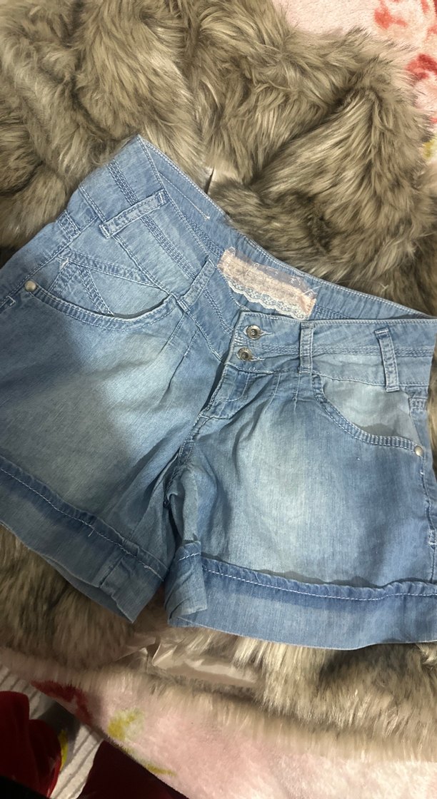 Düğmeli, gevşek kesim mavi denim mini şort, hafif batik desenli. Günlük rahat sokak stili için uygundur.