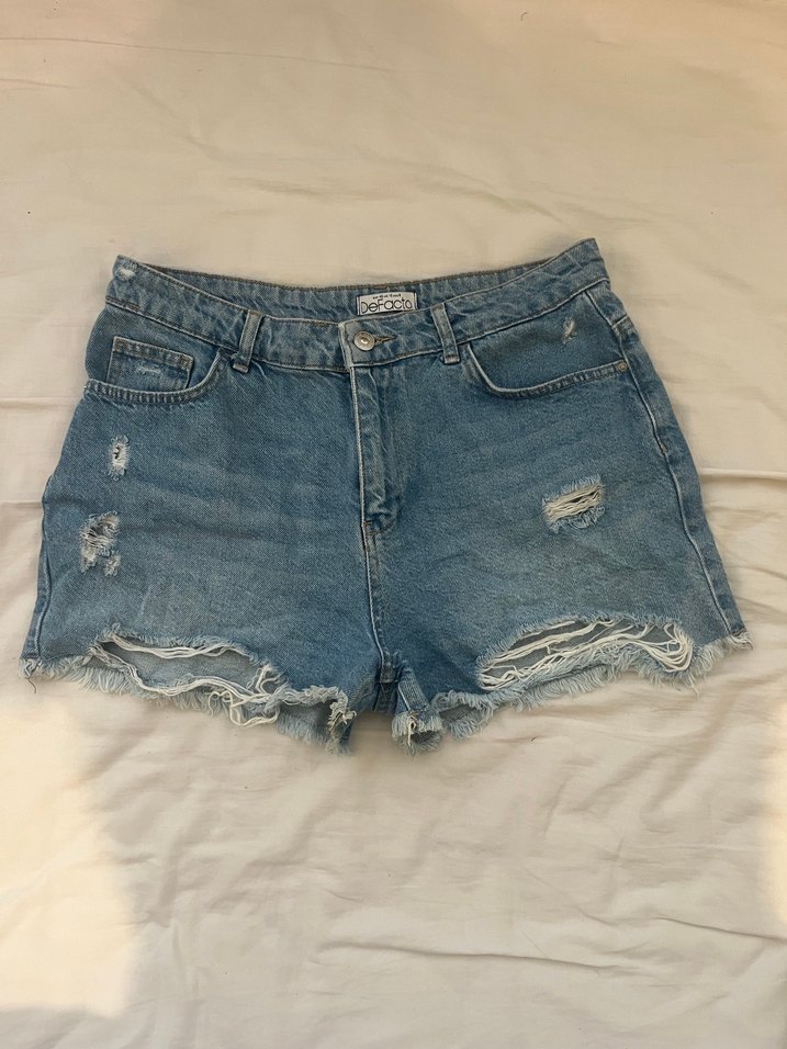 Düğmeli, bol kesim mavi denim mini şort, yırtık detaylı, günlük rahat sokak stili için uygundur.