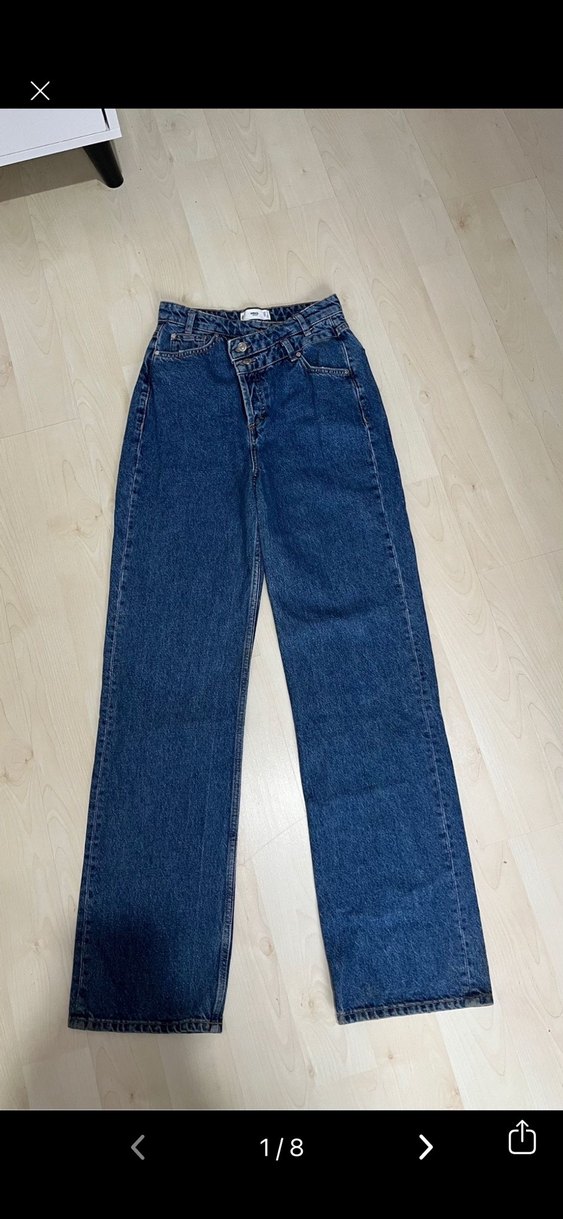 Düğmeli önden kapanışlı, midi boy, mavi denim kadın pantolon. Günlük sokak stili için uygun, rahat kesim ve desen içermeyen sade tasarım.