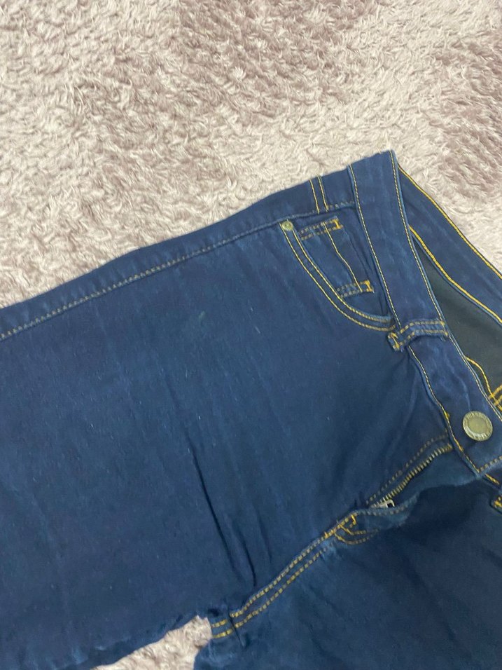 Düğmeli, normal midi boyda, mavi denim kumaştan yapılmış, sıkı kesim kadın pantolonu. Günlük kullanıma uygun, desen içermeyen normcore tarzında ispanyol paça da denebilir bel 72 cm boy 100 cm kumaşı likralı esner yani