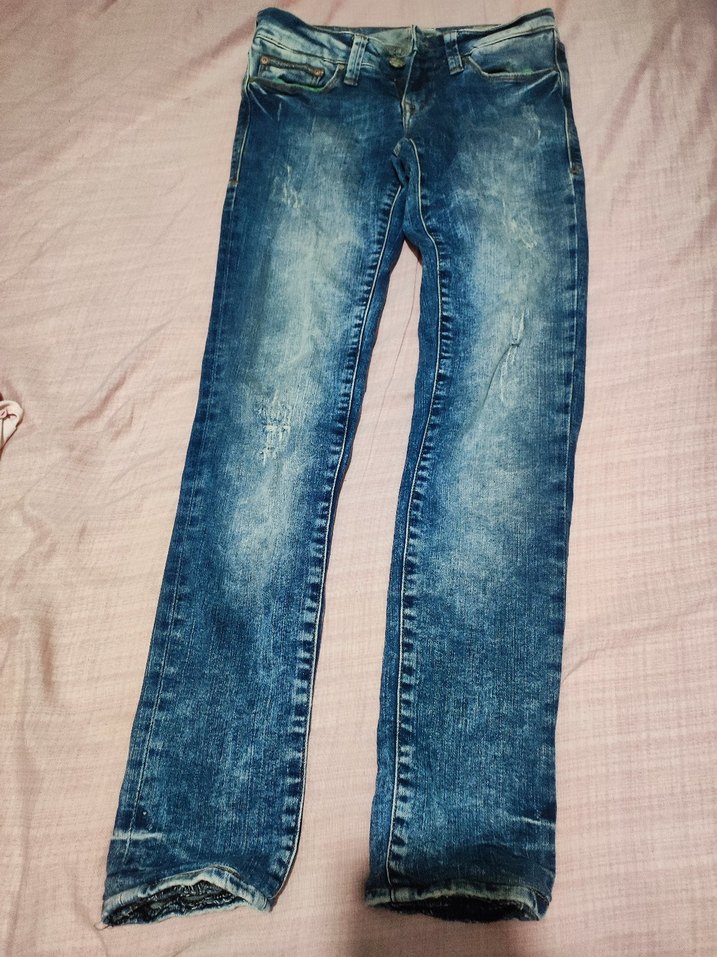 Düğmeli, parlak mavi renkli, bol kesim kadın denim pantolon. Normcore tarzında, midi boy ve desensiz, günlük kullanıma uygun.