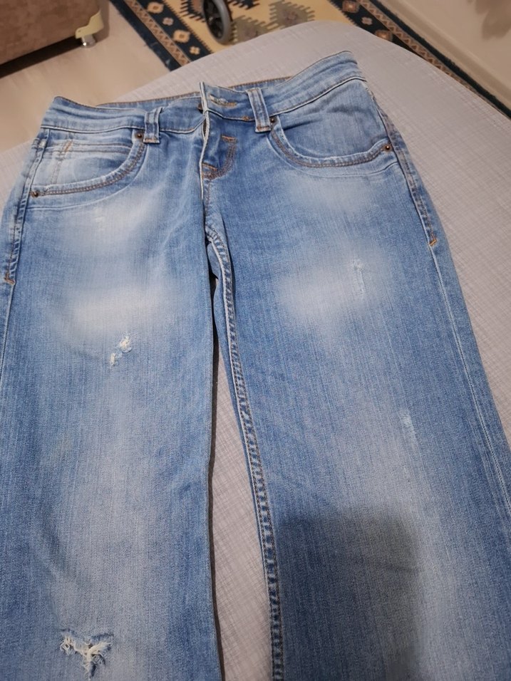 Düğmeli, regular fit mavi denim pantolon. Midi boyda, desen içermeyen, günlük kullanım için uygun rahat sokak stili