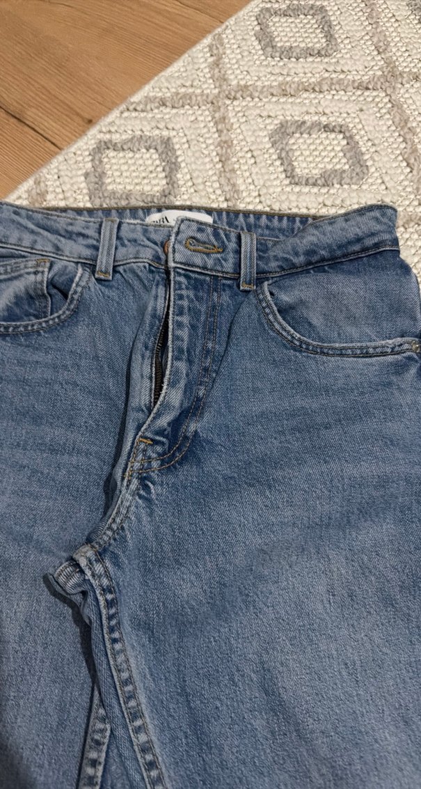 Düğmeli, normal boy, düz kesim mavi kadın denim pantolon, günlük kullanıma uygun rahat bir modeldir.