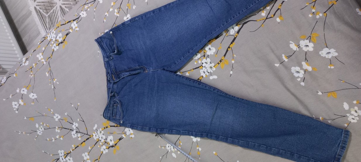 Düğmeli kapamalı, normal boy, mavi renkli kadın denim pantolon. Rahat kesimiyle günlük sokak stiline uygundur.