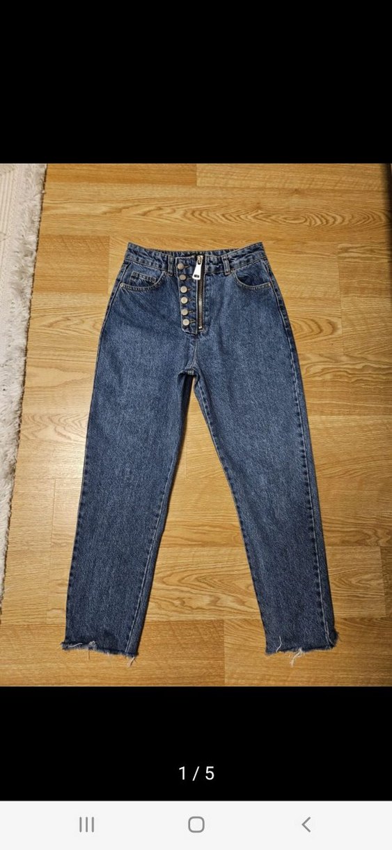 Düğmeli ön kısmı ve parlak mavi renkte, kadın denim pantolon. Normal midi boy ve günlük kullanıma uygun rahat stil.