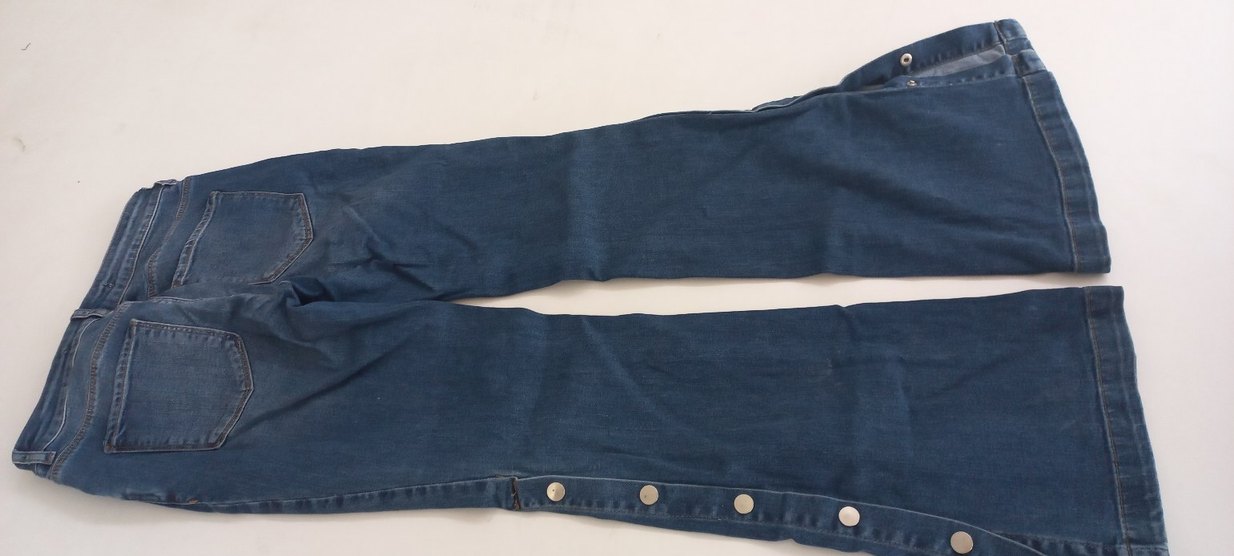 Düğmeli, parlak görünümlü mavi kadın denim pantolon, normal midi boyda ve vücuda oturan kesimde, günlük kullanıma uygundur. hafif ispanyol paca hafif dusuk bel bele oturan yapida pacalarinda dugme detayi var ve citcitli acilir kapanir sekilde kullanima uygundur