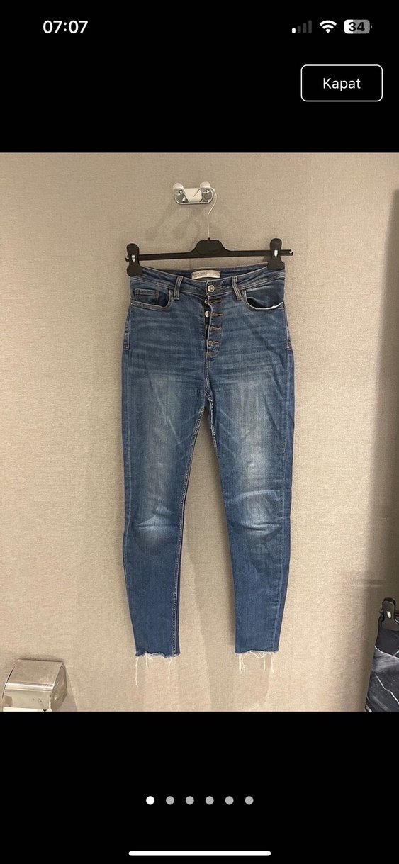 Düğmeli, normal boy, mavi denim kumaştan yapılmış, dar kesim kadın pantolon. Sokak modasına uygun, desen içermeyen günlük kullanım için ideal.