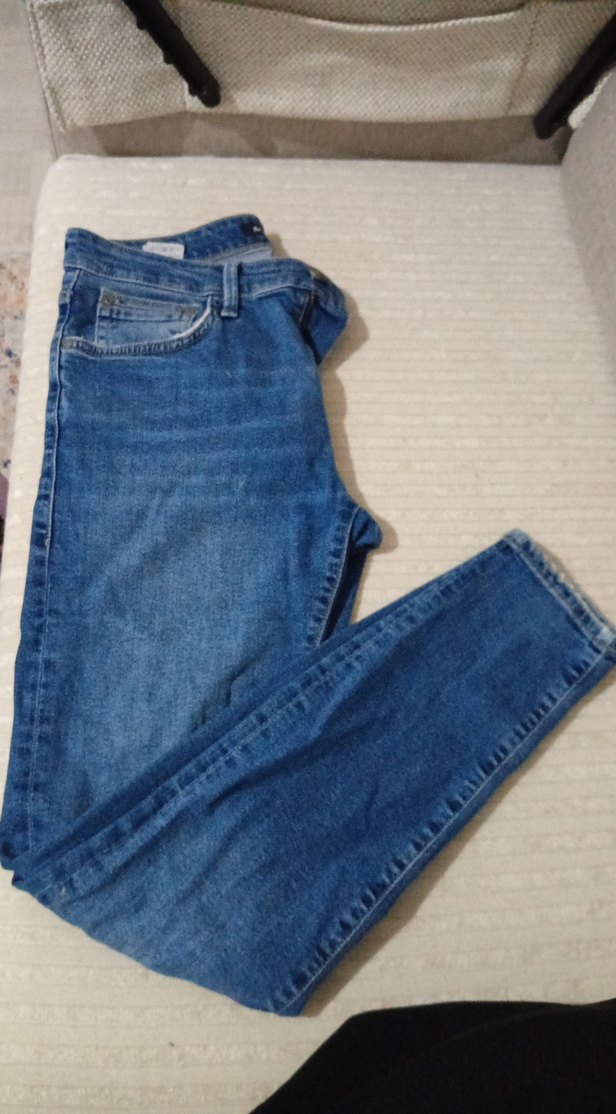 Düğmeli, normal boyda mavi kadın denim pantolon. Günlük kullanıma uygun, rahat kesim ve sade tasarımlıdır.