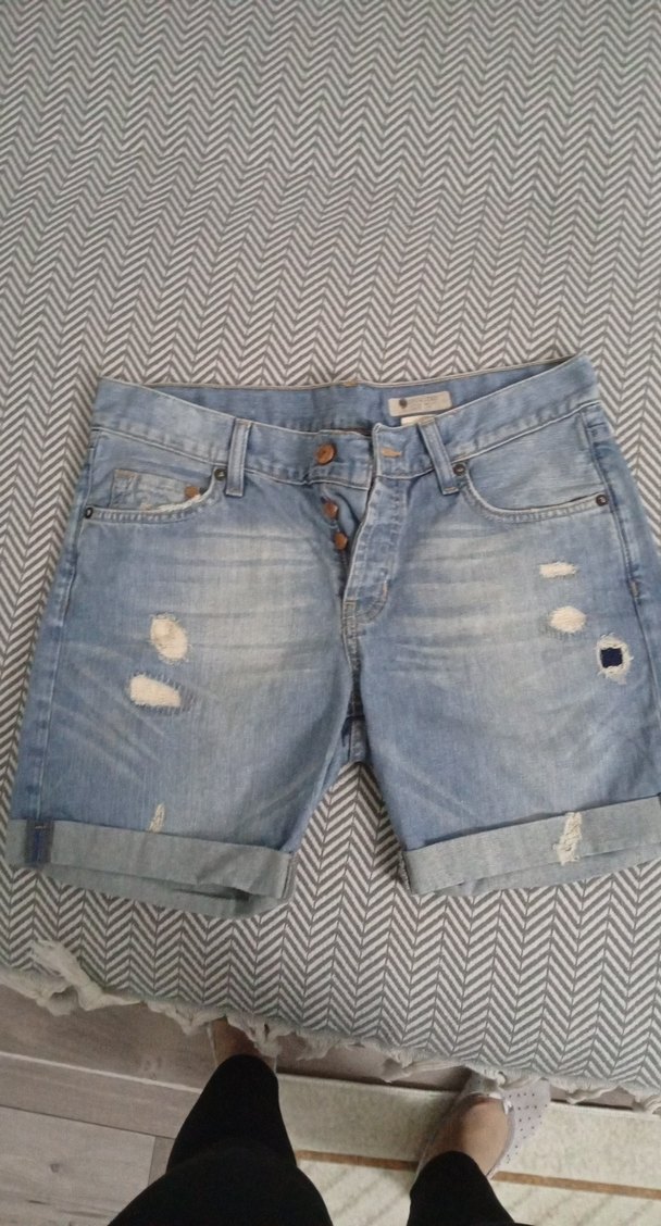 Düğmeli, bol kesim mavi denim şort, kısa boy ve günlük sokak stiline uygun rahat tasarım.