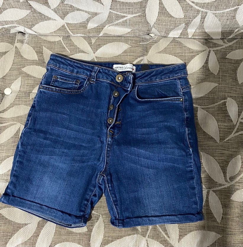 Düğmeli, fitted mavi denim midi şort, günlük kullanıma uygun,rahat tasarlanmıştır. Kilo aldığım için çok az giyebildim,elden çıkarmak için satıyorum. Desensiz ve trend görünüme sahiptir.
