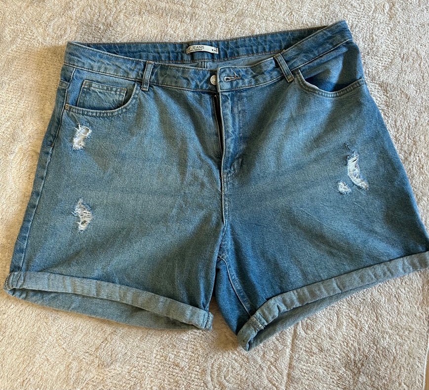 Düğmeli, bol kesim, kısa mini uzunlukta gri mavi kadın denim şort. Desensiz, sokak tarzı ve açık hava için uygun. Benim için çok kullanışlı bir üründü bol geldiği için satıyorum boyu 42 cm eni 104