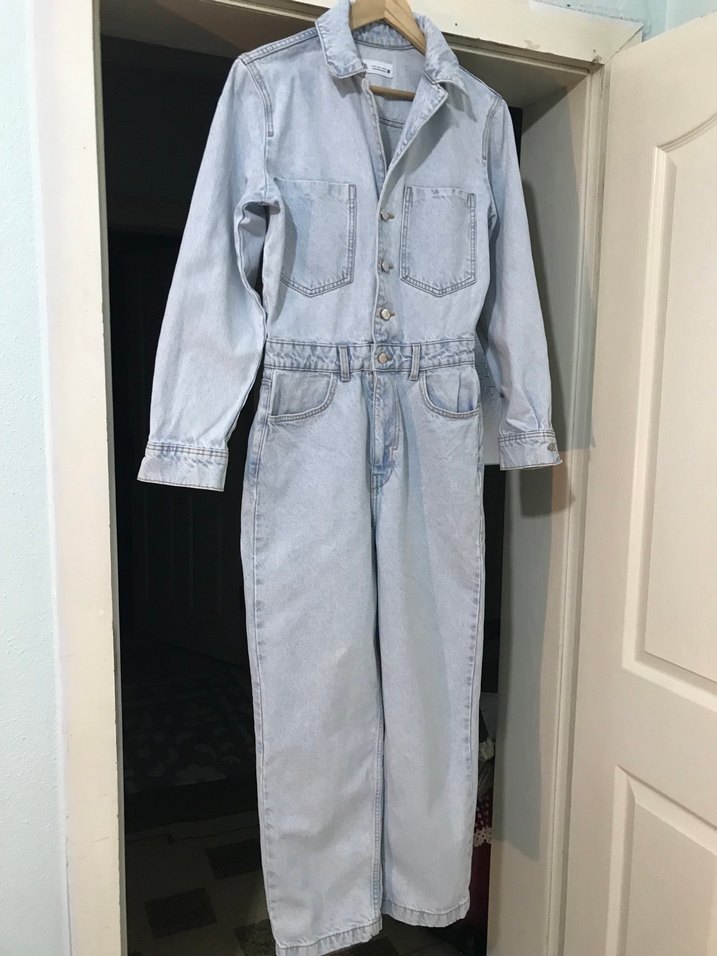 Düğmeli ön kısmı, uzun kollu ve notlu yaka detaylı kadın denim tulum. Regular kesim ve midi boyda, pastel mavi renkte günlük rahat stil için uygun.