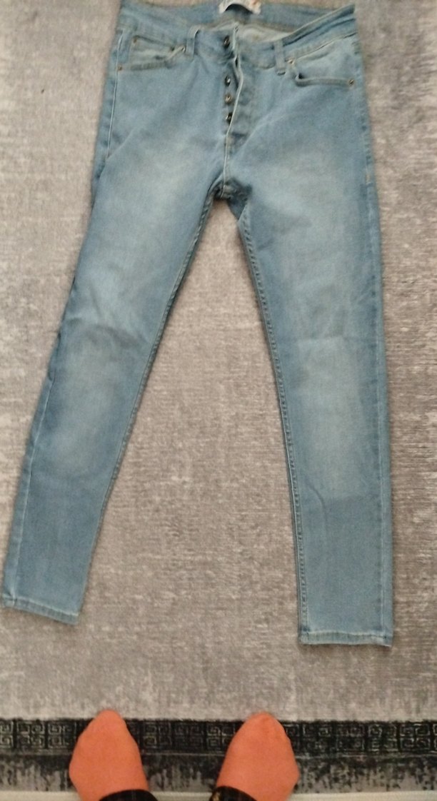 Düğmeli ön kısımlı, normal boy midi uzunluğunda ve rahat kesime sahip mavi denim pantolon. Günlük kullanım için uygundur.Likralidir