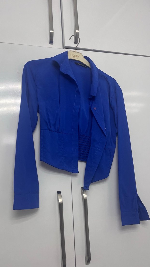 Düğmeli, lacivert sentetik kumaştan, uzun kollu, kısa kesim, dar kesim kadın gömleği. Ofis ve sokak modasına uygun. Isıktan dolayı böyle çıktı rengi lacivert duz.